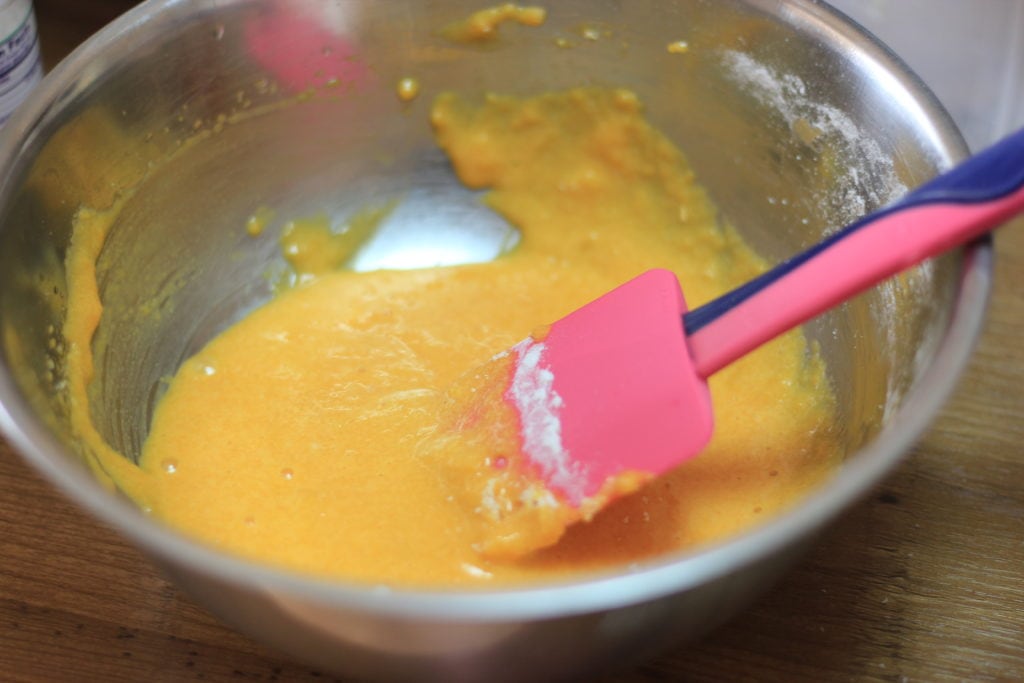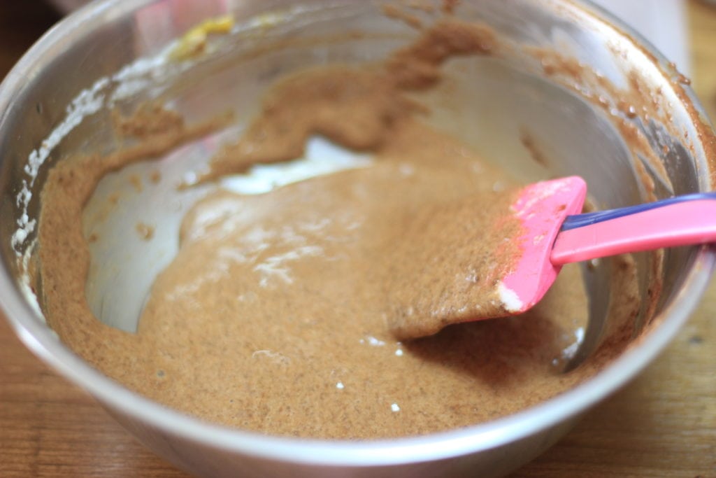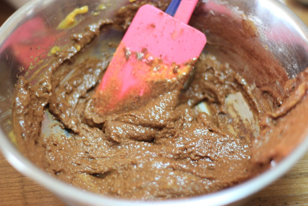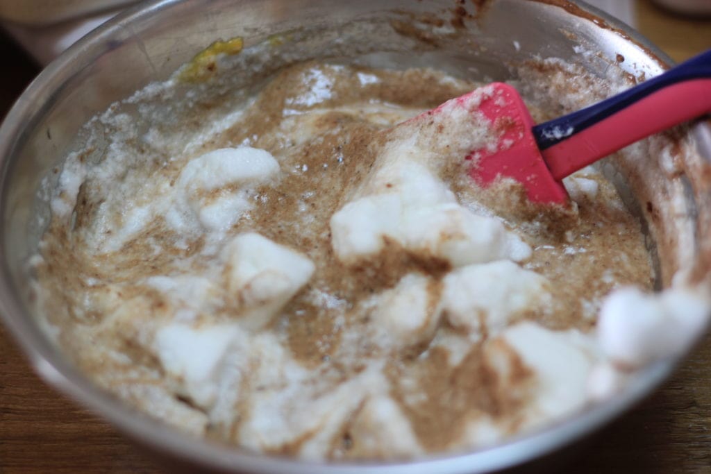 - Add ¼ of the egg whites to the egg yolk mixture and mix together until all of the chocolate mixture has mixed to the egg whites and nothing is stuck to the bowl. Add the next ¼ of the egg whites and gently fold it in. Repeat this step for the last two quarter egg whites.
