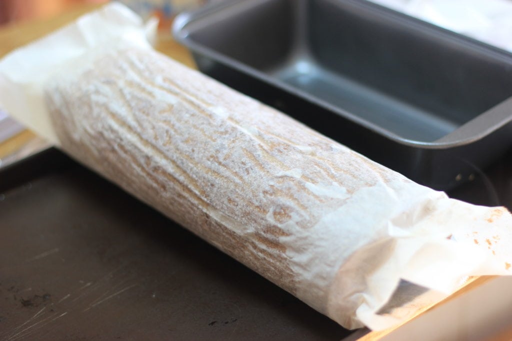 - Once the cake is cooled, roll it out and peel the parchment paper off the cake.