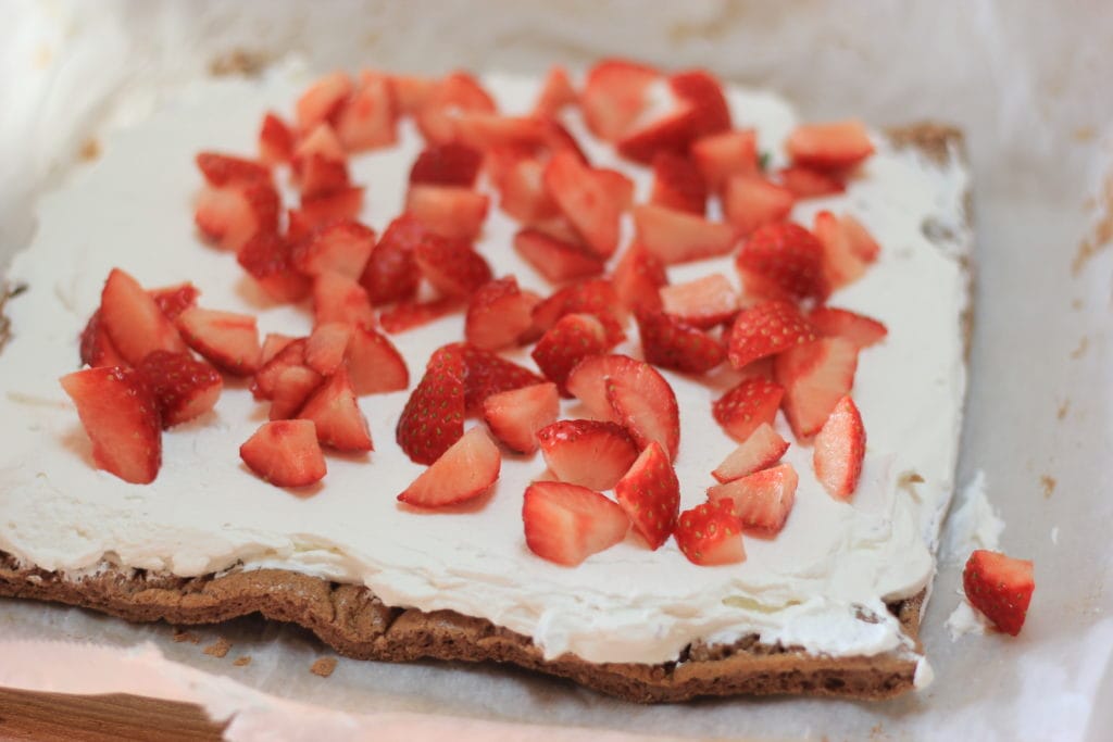 - Spread ⅔ of the whipping cream over the cake and evenly top with some strawberry pieces.