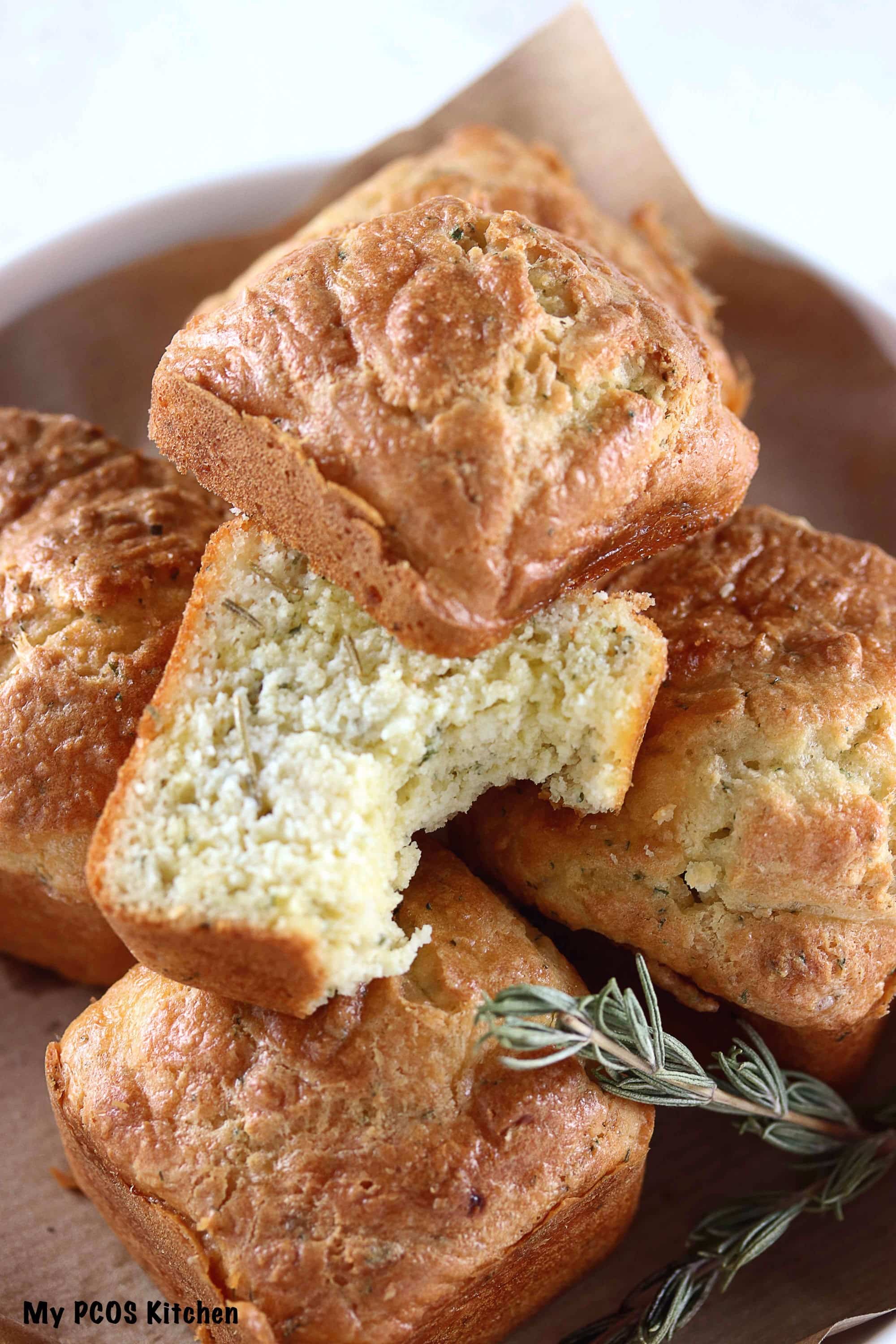 My PCOS Kitchen - Keto Cheesy Biscuits - Low Carb bread cut in half with bite mark.