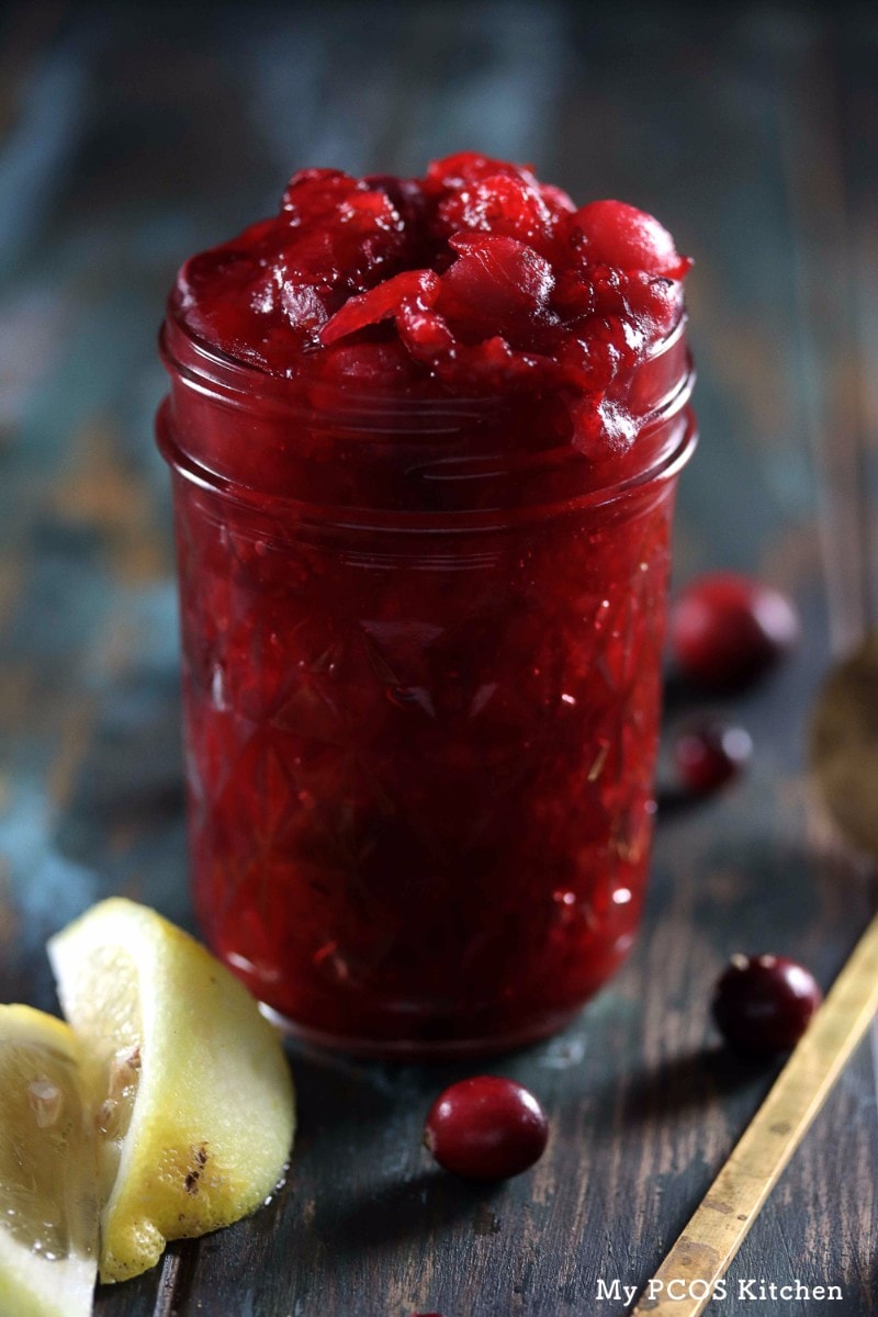 My PCOS Kitchen - Sugar-free Low Carb Cranberry Sauce - Cranberry sauce in mason jar and fresh cranberries with lemon around jar.