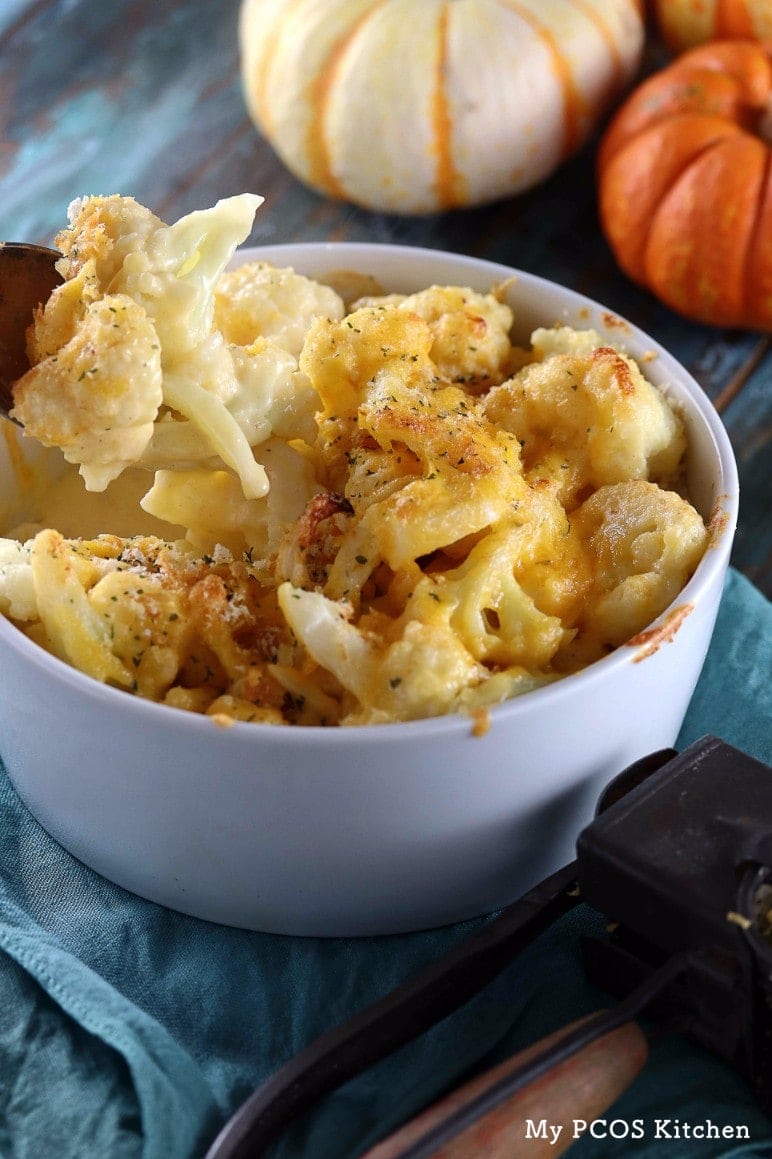 My PCOS Kitchen - Low Carb Three Cheese Cauliflower Mac & Cheese - You don't need any pasta with this delicious and creamy cauliflower! A homemade cheese sauce that is completely gluten-free and starch-free! #lowcarb #keto #lchf #cauliflower #macandcheese