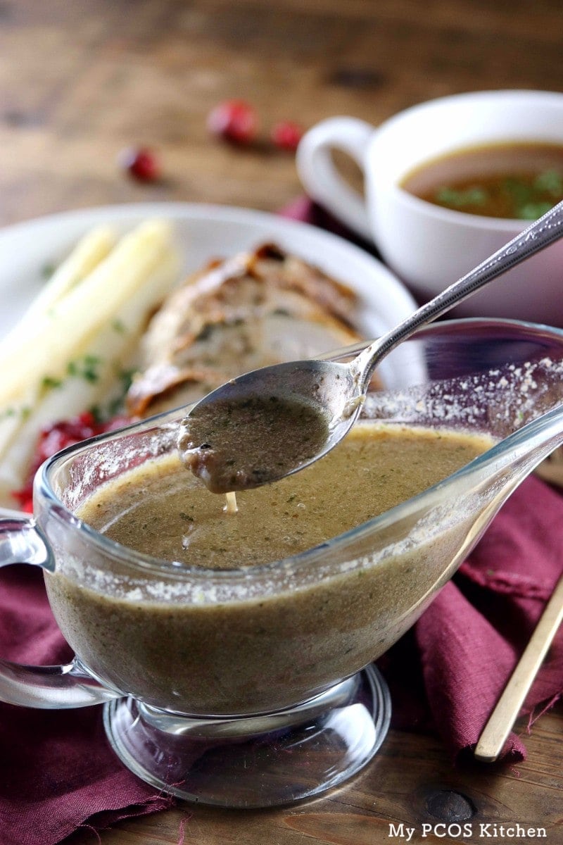 My PCOS Kitchen - Paleo Turkey Giblet Gravy - Turkey gravy in a sauce boat, gravy being drizzled with a spoon.