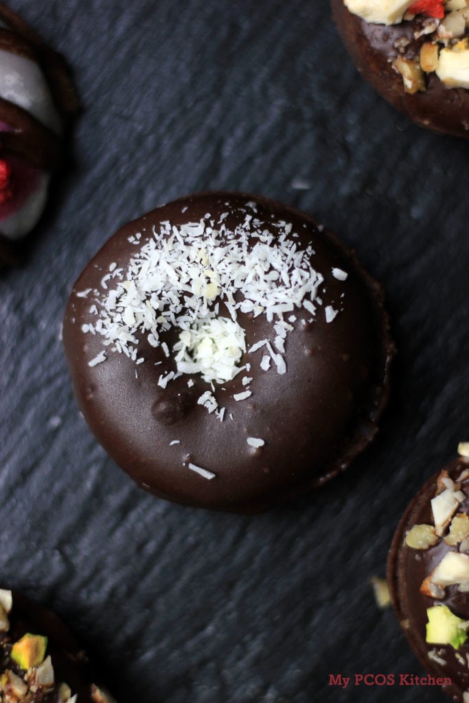 - Immediately top half of the donuts with the coconut flakes while the chocolate sauce is still runny so that they can stick. Once coated, let them cool on the counter (in winter) or in the fridge (in summer).