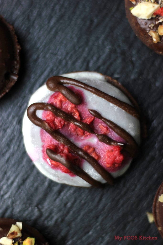 In the versions where I coated the donuts in chocolate sauce, I used coconut oil and cocoa powder, and in the version where there is a why sauce over the donut, it's actually dipped in some soft coconut butter, topped with crushed raspberries and drizzles with chocolate coconut butter.