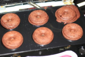 - Pour a bit of the chocolate batter into each hole, barely filled to the top, close the lid and bake for 3-4 minutes. Repeat this step until you have used all of the batter. It should make about 20 donuts.