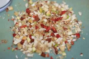 - Chop the nuts and goji berry into tiny pieces and mix together.