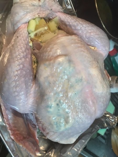 Loosen the skin of the bird by putting your hands between the skin and the breast meat working your way down the leg. Take some of your butter mixture and rub it thoroughly under the skin over the breast and leg meat. Coat as much as you can. It's easier if the butter is at room temperature.