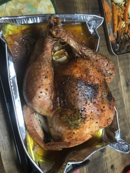 Place the turkey breast side up into the oven on the middle rack and bake for 2.5 hours to 3 hours. Halfway through, baste the turkey juice all over the skin. At 2.5 hours, check the thermometer. It should register at 160F/71C. If you don't have a probe thermometer, open the oven and check with a handheld thermometer. If it's not there yet, cook it a bit longer (10-40min).
