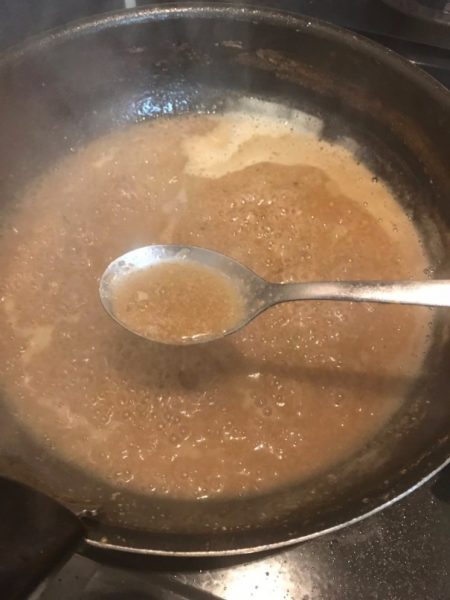 In the stock pot, add the 2 cups (17 fl oz) of roast drippings. A 14lb/6.57kg turkey gave me 2 cups (17 fl oz) of juice. Add the giblet and neck paste into the pot, turn on the heat and start stirring.
